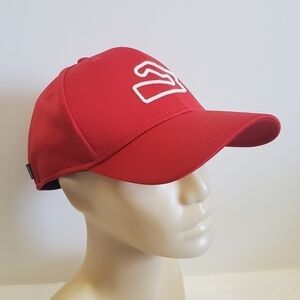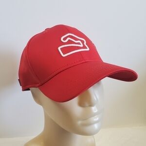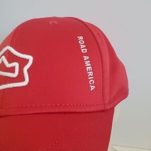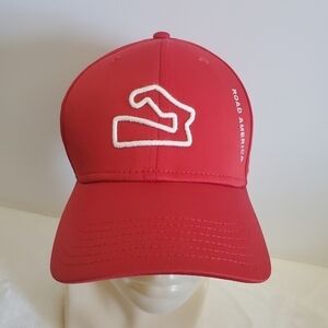Road America Legacy Athletic Red Baseball Hat Cap. The world's fastest road racing circuit! Men's size small to medium, curved bill, botton top, ventilation holes around crown, white embroidered logo on front & side panel, Legacy tag on side, elastic band for a custom fit, shiny & smooth polyester/spandex blend. No rips, snags or stains. Like new condition!