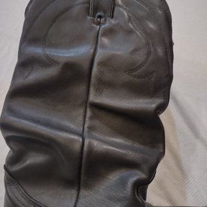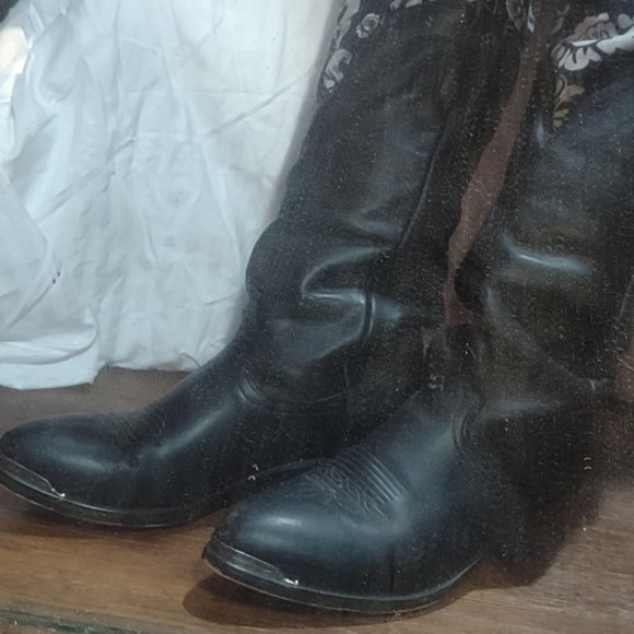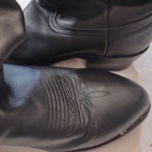 ROAD WOLF, VINTAGE, BLACK, REAL LEATHER, WOMAN'S COWBOY BOOTS, SIZE 8.5, METAL ACCENT AT TOES, VERY MINOR SCUFFS AND MARKS ON HEELS AND TOES, SOME WEAR AROUND RIM. PRETTY GOOD CONDITION FOR BOOTS WELL WORN AND WELL LOVED! SOLE IS VERY WORN BUT BRANDING CAN BE MADE OUT. (3lb2oz)