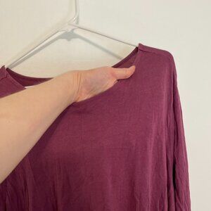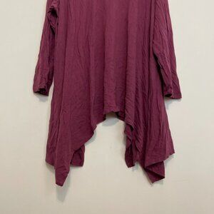 ◇ Roman's VANITY plus size 3X / standard plus size 30 / 32 - fits standard plus size 5X (size chart in photos). Solid berry purple ish and/or pink ish tint. Asym asymmetrical draped sharkbite handkerchief hem. Seems to be long longer tunic length. Round neck ish and/or wide neck approx long sleeve blouse top shirt