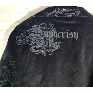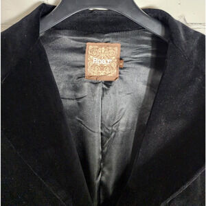 ROAR VELVET Blazer Jacket Mens Sz L Black Graphic Print Two Button Elbow Patch