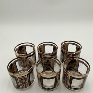 Set of 6 Roaring Twenties silent film actor’s whiskey glasses with gold trim. Excellent condition, no chips or cracks.