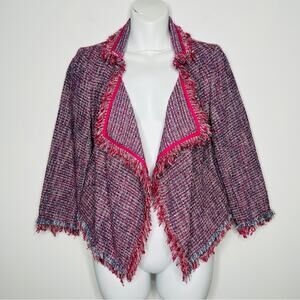 3/4 sleeve tweed open front blazer jacket with cute frayed edges and asymmetrical drape fit. Pink, blue, white, and red colors with hot pink piping.
