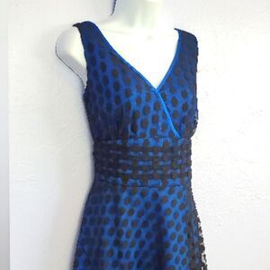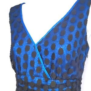 Gorgeous dress! Black sheer polka dot print over bright blue lining, zips on side. Detail at waistband.