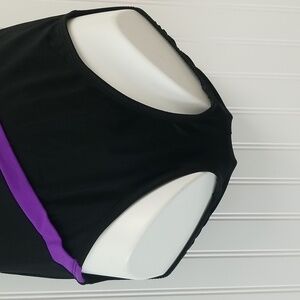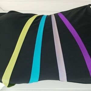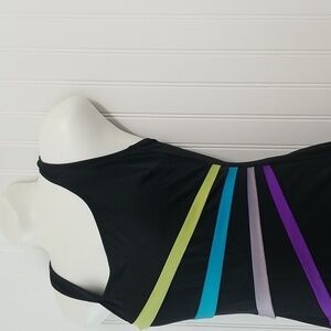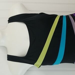 Robby Len Swim Suit. This one piece swim suit in black with multi color sewn on stripes. Built in shelf bra with padded cups. U back. A small amount of natural pilling on the inside but still in GUC. Womens 8.