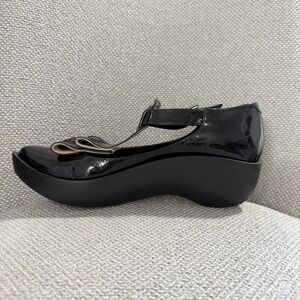 Chick black patent leather Mary Jane platform shoes from Robert Clergerie Paris. Comfortable almond toe shape, 1"(toe)-2" (heel) platform heel style. The ankle strap, adjustable buckle, and glossy black patent leather make these shoes a versatile addition to any wardrobe.