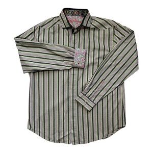 ROBERT GRAHAM Button Up LS Shirt sz XL Gray & Multicolor Stripe Floral Cuff/Trim