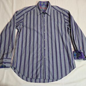 ROBERT GRAHAM DRESS SHIRT MENS LARGE CLASSIC FIT BLUE PURPLE STRIPE FLIP CUFF