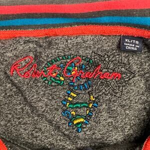ROBERT GRAHAM sweater in a charcoal grey cotton knit featuring a waffle knit design, contrasting rainbow striped collar, and half zip closure.Excellent Pre-Owned Condition.Marked: XLMeasurements:Shoulder: 18 in.Chest: 47 in.Sleeve: 23 in.Length: 25 in.