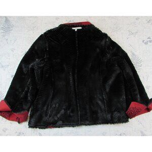 ROBERT KITCHEN Red Faux Suede Black Fur Reversible Jacket Boho Lagenlook XLlove love lovewomen's size XL X Largefun jacket and its reversible and washableoutside is red with black print button frontother side is butter soft black furso cutefrom Canadameasured laying flat across the frontshoulder to shoulder:18"pit to pit:24"length:26"sleeve:25" unrolledROBERT KITCHEN Red Faux Suede Black Fur Reversible Jacket Boho Lagenlook XL
