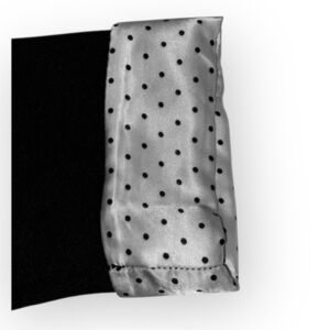 •The cuffs that are white satin feel material •dainty black polka dots.