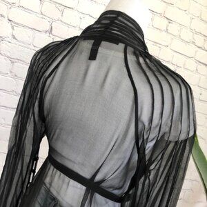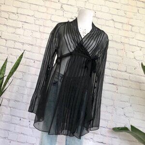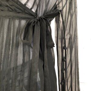 Stunning Sheer black silk long sleeve wrap style blouse. Little accent buttons going down the bell sleeves. Layered texture on the chest, wrap around tie on the side. Great for formal occasions or casual. New without tags.