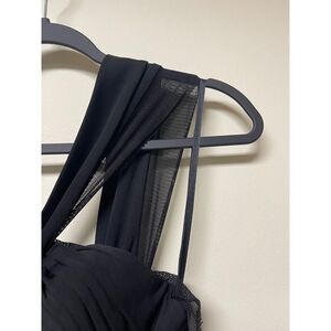 Black formal gown with corset top, mesh overlay on corset with mesh detail up the left strap. Draped at the waist. Zipper up the back. No materials tag. Worn once, dry cleaned and stored. From my personal closet.