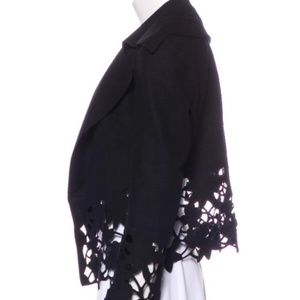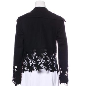 Black Robert Rodriguez wool jacket with laser cut panel at hem, long sleeves and open front.