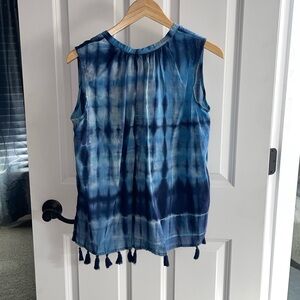 Stylish blue tie-dye sleeveless top featuring tassel details. Perfect for casual outings.