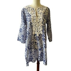 Womens size Medium, 100% breathable cotton, floral and fleur de lis pattern, tunic length, side slits, split neck with beautiful white embroidered bodice, 3/4 sleeves.