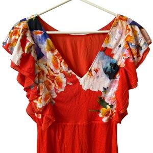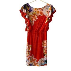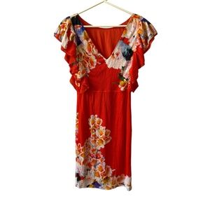 Size 6, orange floral, silk lined, ruffle sleeves, pull on, slim fit, jersey, knee length.