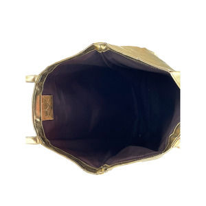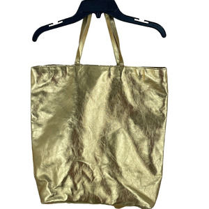 BRIGHT METALLIC GOLD TOTE BAG. BROWN FABRIC LINING INSIDE THE TOTE BAG. GREAT FOR TRAVELING, EVERYDAY USE, OR AS A BEACH BAG.