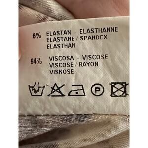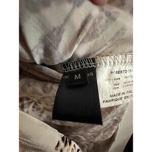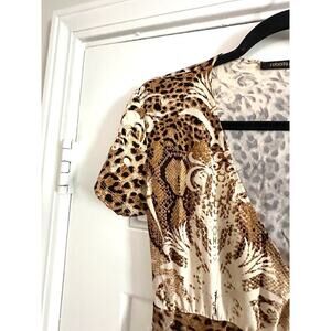 Gently pre-owned. No rips or stains. Deep v-neck neckline. Gold-tone metal and rhinestone python at base of neckline.