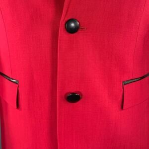 ROBERT CAVALLI sport coat in a raspberry red wool blend fabric featuring contrasting black lambskin leather trim and buttons, notch lapel, ventless back, and double button closure. Made in Italy.