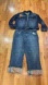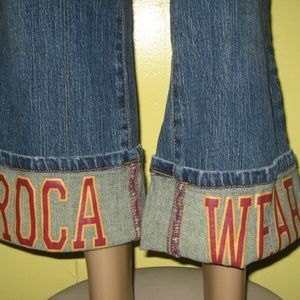 Jeans can be worn 2 ways, capri cuffed with Roca Wear spelled out OR jeans un-cuffed as a straight leg jean. Fly button zip closure, Button down jacket, button closure at chest and end of sleeve, red patches at chest99% cotton, 1% Spandex (SLIGHT STRETCH)