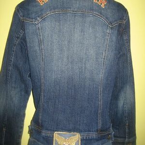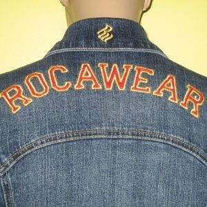 Jacket: Roc it your way. . Button front closure with button-flap patch pockets at chest, logo applique at right chest, lurex stitched RW at center of upper backside and arched ROCAWEAR signature across upper backside.