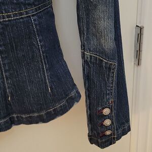 Has some missing rhinestones. Metal jeweled buttons and front pockets.