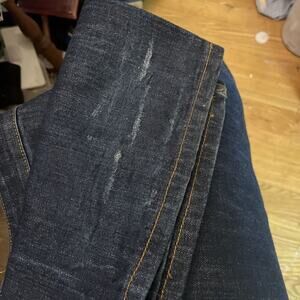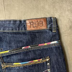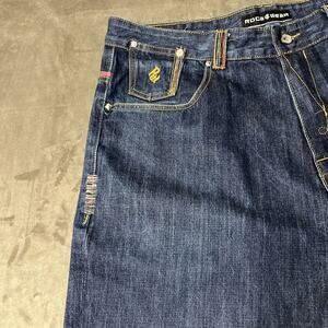 For the fashion-forward man, check out these Rocawear jeans in size 42 with a classic zip fly closure. The dark blue denim is perfect for any occasion and the wide-leg style provides a comfortable fit. These pre-owned jeans have been well-maintained and are in excellent shape to ensure a long-lasting wear. Designed for regular size and made of high-quality denim fabric, these Rocawear jeans are a must-have for any stylish man's wardrobe.
