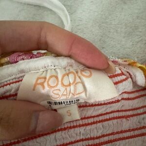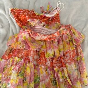 FROM REVOLVE SOLD OUT OUT ONLINE Vibrant-piece with ruffled details. Features a mix of pink, orange, and yellow hues.