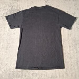The product is a vintage Rock and Roll Hall of Fame Museum T-shirt in size small, featuring a double-sided graphic print of iconic rock and roll characters. Made of a comfortable cotton blend with a crew neckline and short sleeves, this regular fit shirt is perfect for any music enthusiast or fan of the Rock and Roll Hall of Fame. Machine washable and with a stretchy material, this black tee is a stylish addition to any wardrobe, representing the theme of the Rock & Roll Hall of Fame Museum in a classic graphic tee style.