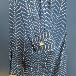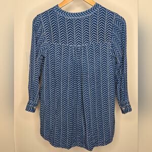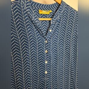 Stylish blue patterned button front womens tunic with a comfortable fit. Perfect for casual outings or a day at the office.