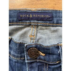 ROCK & REPUBLIC 'Berlin' blue denim jeans in size 6 (30). Featuring a striped seam pattern, logo embossed rivets/button, and distressed accents for a unique touch. The mid-rise waist and straight fit make them a versatile addition to any wardrobe, while the spandex-cotton blend and zip fly ensure a comfortable and secure fit.