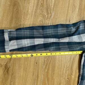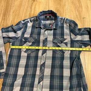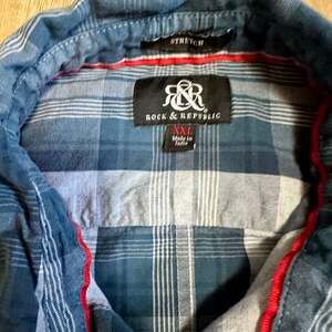 Rock & Republic stretch button-down shirt in a stylish teal and gray plaid, perfect for a casual yet put-together look. This long-sleeve shirt features roll-tab sleeves for versatile styling, allowing you to easily adjust sleeve length. Made from a comfortable stretch fabric for ease of movement. Excellent pre-owned condition with no significant flaws. "Sold out online".