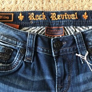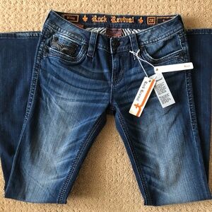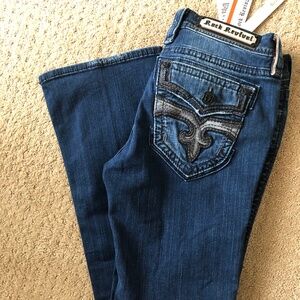 ROCK REVIVAL RILEY JEANS, SIZE 28, BOOTCUT, DESIGNER JEANS NEW WITH TAGS, LENGTH 33”
