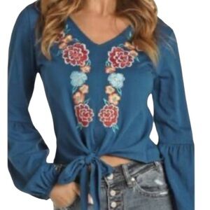 ROCK & ROLL COWGIRL - SIZE XL - BLUE/TEAL CROP TOP WITH FLORAL APPLIQUÉ B13