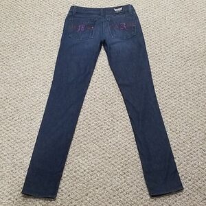 Skinny jeans featuring purple embroidery and rhinestones on the back pockets. Single button and zipper front closure. Silver hardware. Whiskering accents. Five pockets.