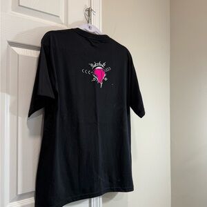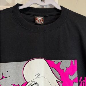 Black t-shirt featuring a vibrant pink anime graphic. Perfect for fans of bold designs.