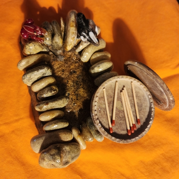 Hand made with rocks, a ceramic match holder with abalone flower inlay and match striker strip. A glass frog figurine, a ceramic turtle, and felt rounds on bottom to prevent scratches.