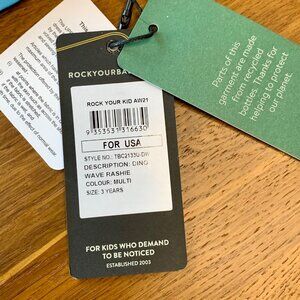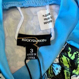 This Rock Your Baby surfing dinosaurs swim rashie is perfect for your 3-year-old boy. Made of polyester/elastane, this surf top is new with tags. UPF 50+. So cute and with great coverage from the sun.
