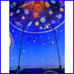 -The tent is the shape of a spaceship. The inside design at the bottom is a very cool driving compartment. Look up at the top of the tent, and you'll see rockets, other spacecraft, flying saucers, satellites, the sun & the planets.