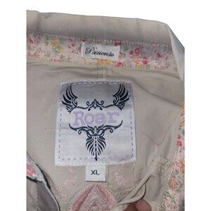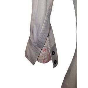 Embroidered details steal the spotlight on this captivating blouse. This top showcases a unique, faded gray wash, accentuating the eye-catching embellishments on the front, back, and sleeves. Elegant floral fabric peeks out from the cuffs, while 3/4 sleeves add a touch of modern sophistication. This design is complete with two chest pockets and a classic button-up front.