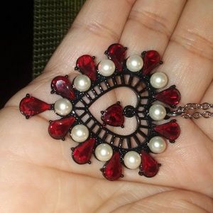 The elegant ROCKIN RICHES HEART PENDANT features opulent faux pearls and jewels and accented heart in the center of a delicate silver chain. Wears well with most outfits. Makes a great gift too.