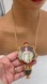 Only one in stock. Gold tone metal. Printed images. Enamel detailing. Rococo design. Necklace is 24-27”