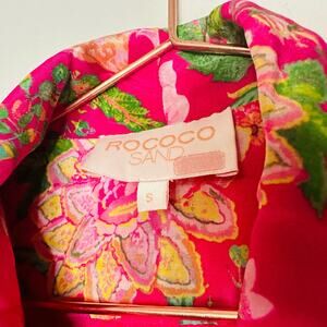 ROCOO SAND Chloe Pink Floral Long Sleeves Wrap Maxi Dress Size Small. This dress is a perfect choice for a spring or summer event. The pink floral print is cheerful and feminine, while the wrap silhouette flatters most body types. This is a long, flowing dress that wraps around the body and secures with a tie at the waist. It's a versatile style that flatters most body types and can be dressed up or down depending on the occasion. The long sleeves add a touch of coverage and can be ideal for cooler evenings.