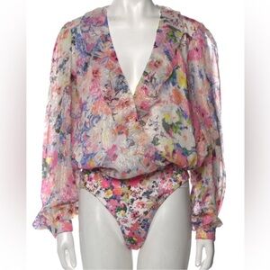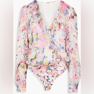 ROCOCO SAND Lelia Lurex Bodysuit Ruffled Floral Georgette Metallic Coquette M