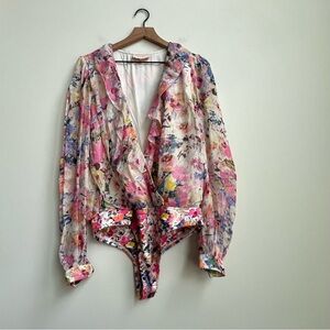 Bodysuit floral-print georgette ruffled buttoned Cuffs snap