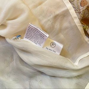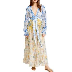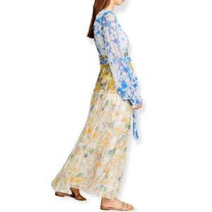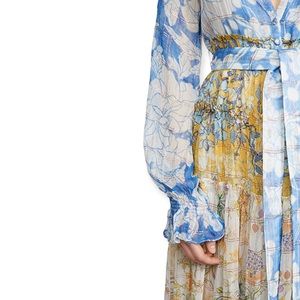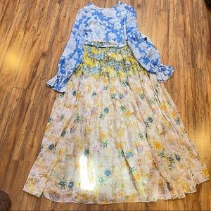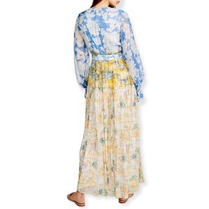 Lightweight chiffon fabric, blue yellow colorblock floral pattern perfect balance of femininity & elegance. Delicate metallic threading. Tiered skirt with flounce hem & ruffle trim. Longsleeves with smocked cuffs. Button closure & optional waist tie. Pairs feminine prints with soft silhouettes, creating modern-bohemian aesthetic that's effortlessly beautiful. Perfect for stroll in the sun, or with slides and pared-back jewelry for seaside cocktails.