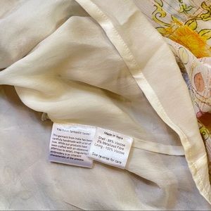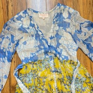 Lightweight chiffon fabric, blue yellow colorblock floral pattern perfect balance of femininity & elegance. Delicate metallic threading. Tiered skirt with flounce hem & ruffle trim. Longsleeves with smocked cuffs. Button closure & optional waist tie. Pairs feminine prints with soft silhouettes, creating modern-bohemian aesthetic that's effortlessly beautiful. Perfect for stroll in the sun, or with slides and pared-back jewelry for seaside cocktails.