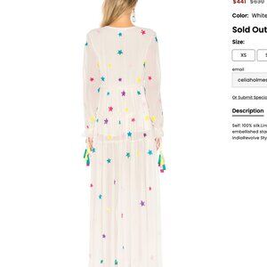 Self: 100% silk.Lining: 100% viscose. Dry clean only. Partially lined. Button front closure. Sequin embellished star accents throughout. Sleeve ties with tassel accents. Semi-sheer. Made in IndiaRevolve Style No. ROCS-WD26. Manufacturer Style No. RST 18 STELLAR DR BD126.