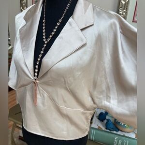 RO+DE TAUPE SATIN FORMAL FLUTTER DOLMAN SLEEVE COLLARED V-NECK CROP TOP SZ L