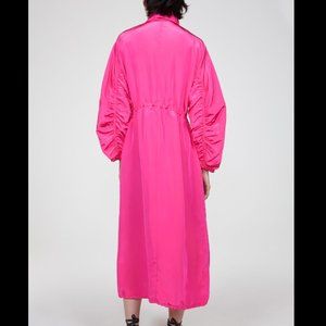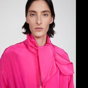 Inspired by the classic tie-neck blouse, Leandra is a contemporary coat with dropped shoulders and a scarf collar detail. This statement piece is made with a blend of lightweight viscose and polyester, giving the flowy material a subtle light-catching sheen. At once playful and polished, the design is finished with side pockets, ruched sleeves and a two-way zip.